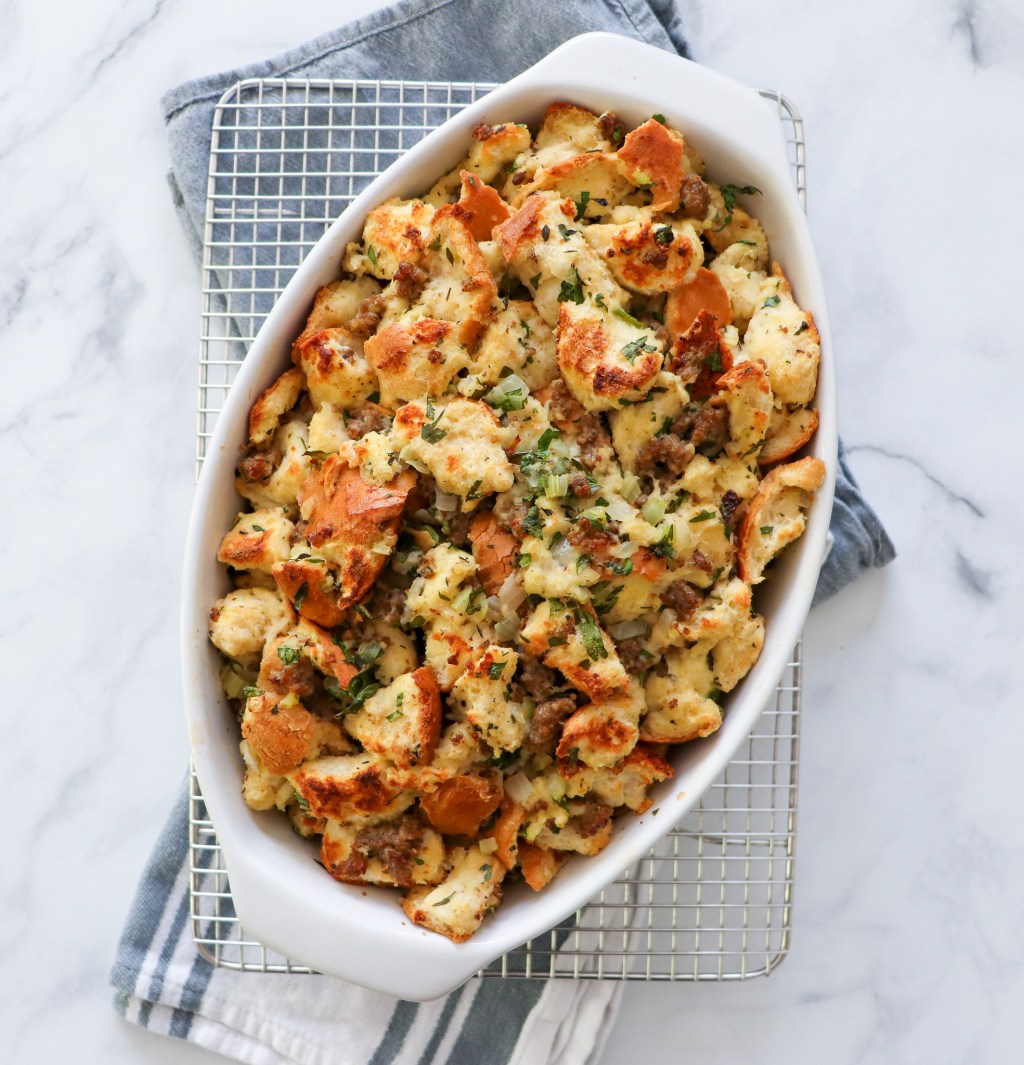 - In a very large bowl transfer bread, add sausage mixture, parsley, sage, rosemary, thyme salt/pepper and gently stir to distribute. In a small bowl beat eggs and add remaining 1 1/2 cups stock. Pour evenly over dressing mixture and mix one more time. Be gentle as the bread will have soaked up a lot of liquid and we don’t want to break it up any further. I like to do this with gloved hands because it’s easier.